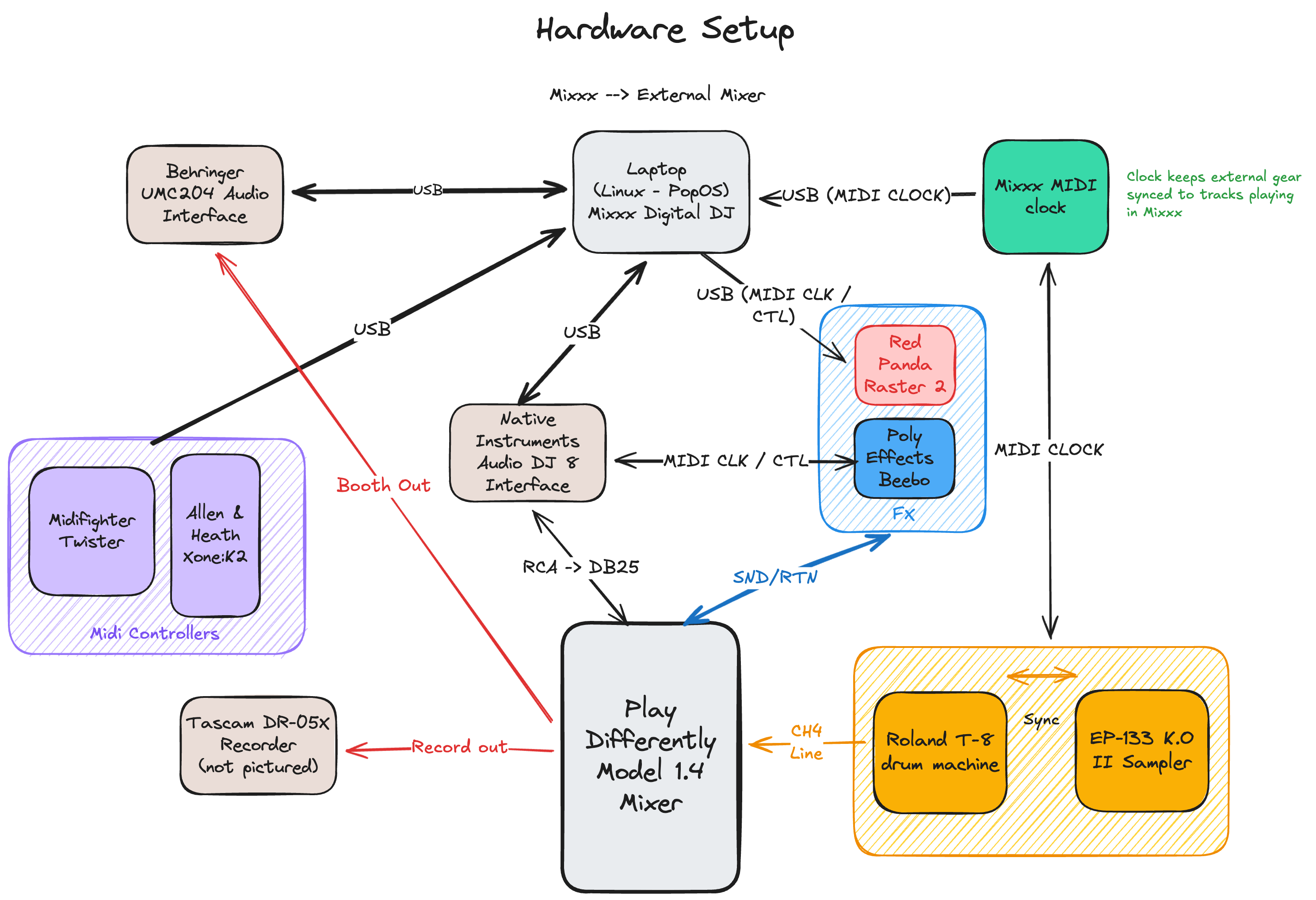 MIDI clock signal is generated by the Mixxx MIDI clock and distributed to software and devices over USB and MIDI DIN. This is fundamental to keeping external gear like the drum machine in sync with tracks playing in Mixxx. It allows me to set tempo shift beat phase on external gear (beat match)